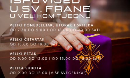 Nedjelja muke gospodnje – Cvjetnica 29. ožujka Svete mise u 8.00 i 19.00 sati Veliki ponedjeljak, utorak i srijeda 30. ožujka – 1. travnja Svete mise u 8.00 i 19.00 […]